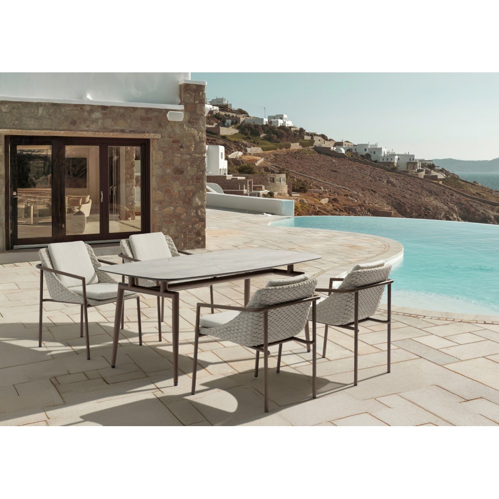 Вишукана конструкція у темному бронзовому відтінку, майстерно сплетений каркас, зручні сидіння та спинки, обтягнуті якісною тканиною, стійкою до будь-яких погодних умов. Ця колекція ідеально поєднує комфорт і стиль, властиві продукції Kolibry Outdoor.